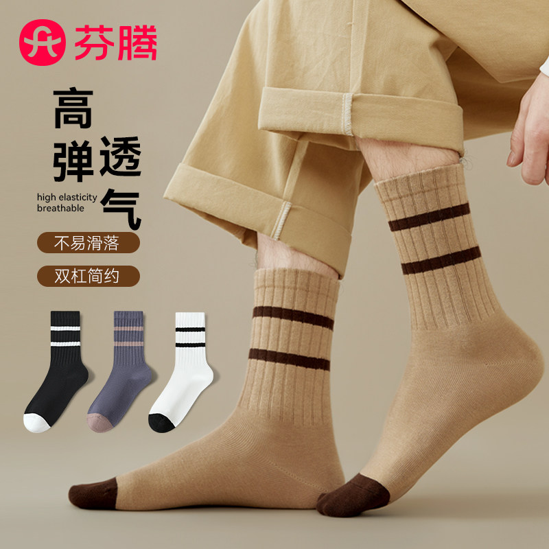 袜子男士中筒袜纯棉复古双针新款撞色吸湿日系纯色长袜秋冬季男袜