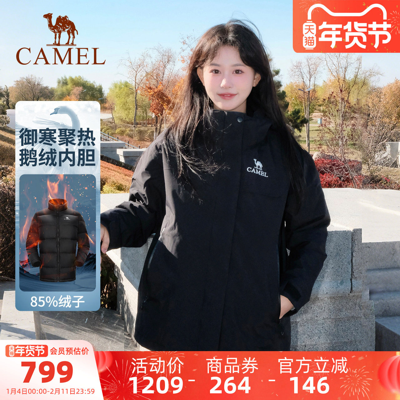 骆驼户外冲锋衣女款26年三合一鹅绒内胆三防保暖羽绒登山服外套男