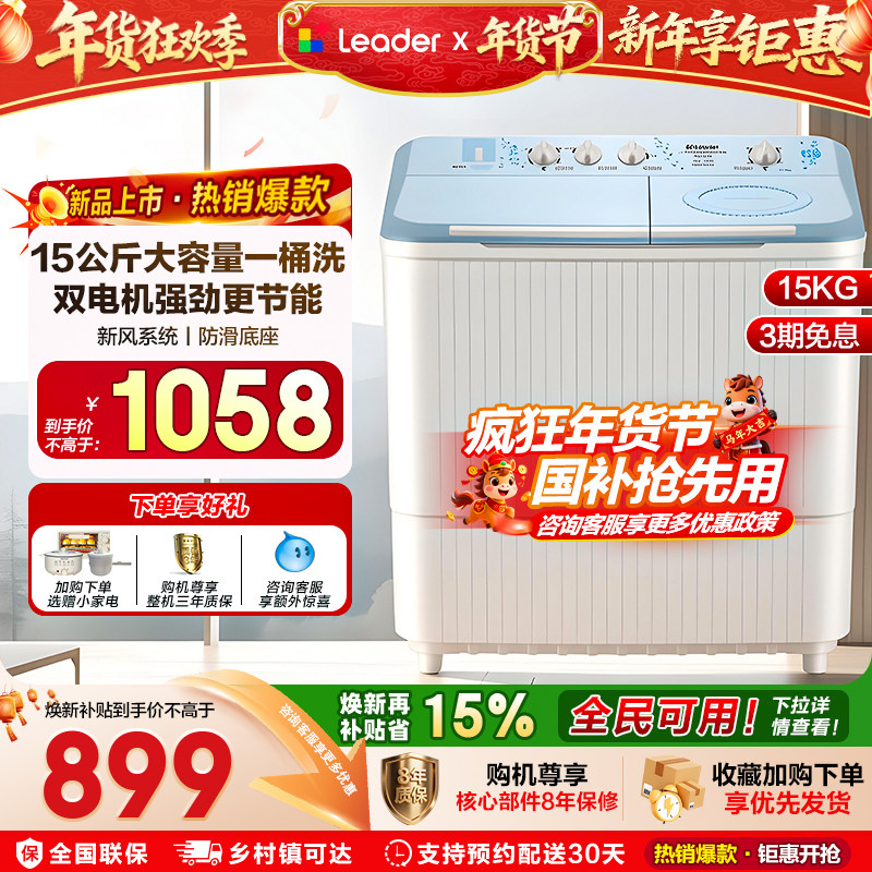 [换新补贴]海尔15公斤双缸双桶波轮老式半自动洗衣机家用统帅官方