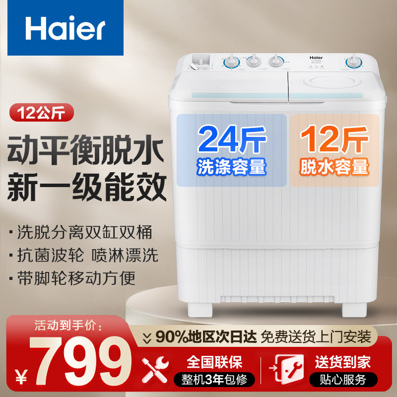 海尔半自动洗衣机双桶双缸9公斤 12kg老式家用大容量出租屋小神螺