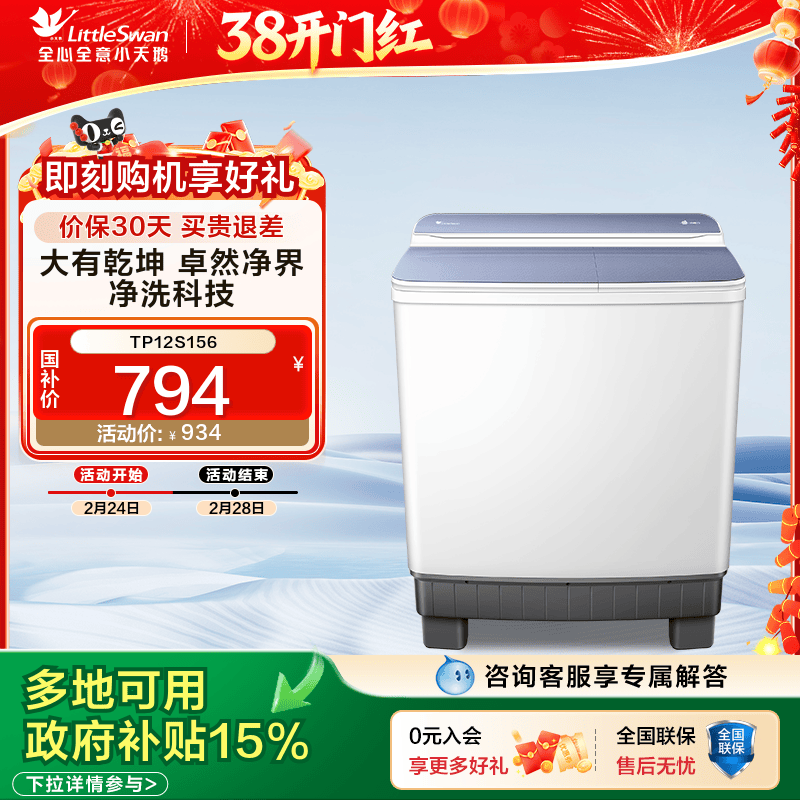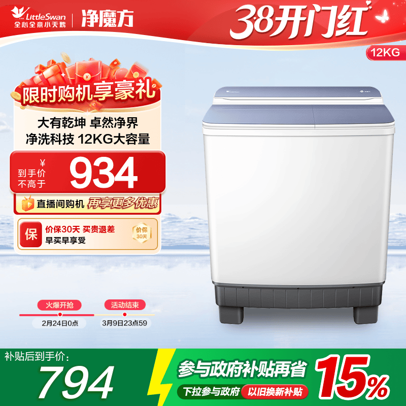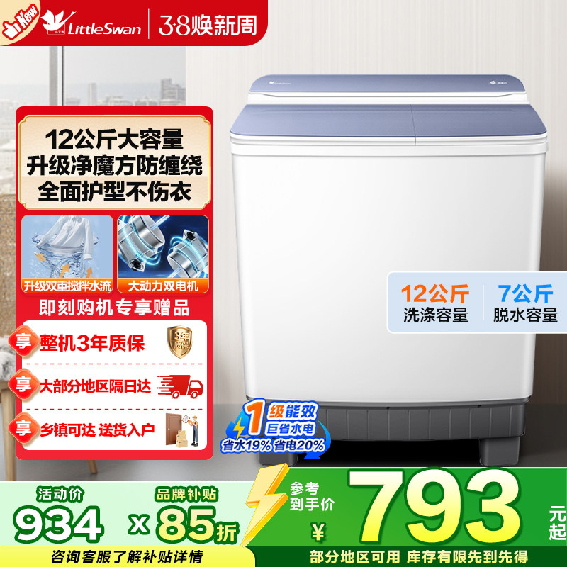 小天鹅半自动洗衣机12公斤一级能效家用波轮双桶双缸老式大容量