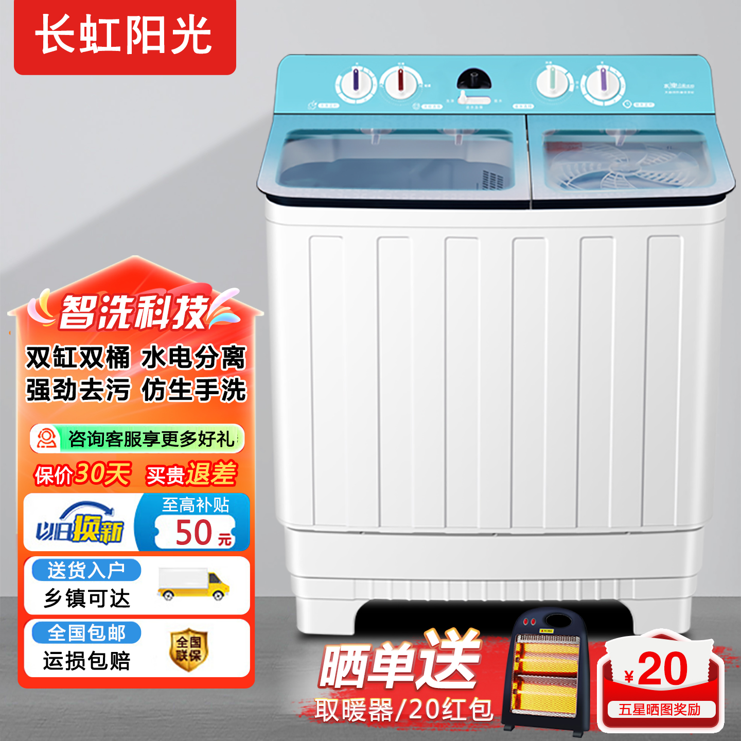 长红视洁半自动洗衣机家用大型容量20/100公斤宾馆商用老式双缸桶