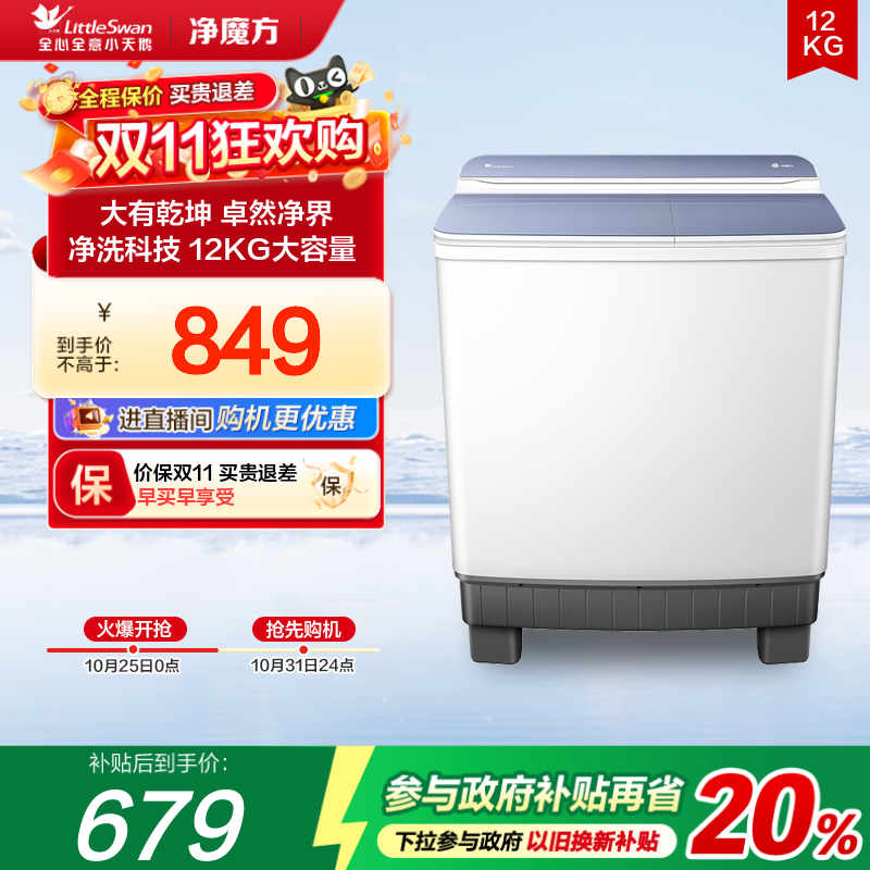 【净魔方】小天鹅12KG大容量双桶双缸半自动洗衣机波轮TP12S156