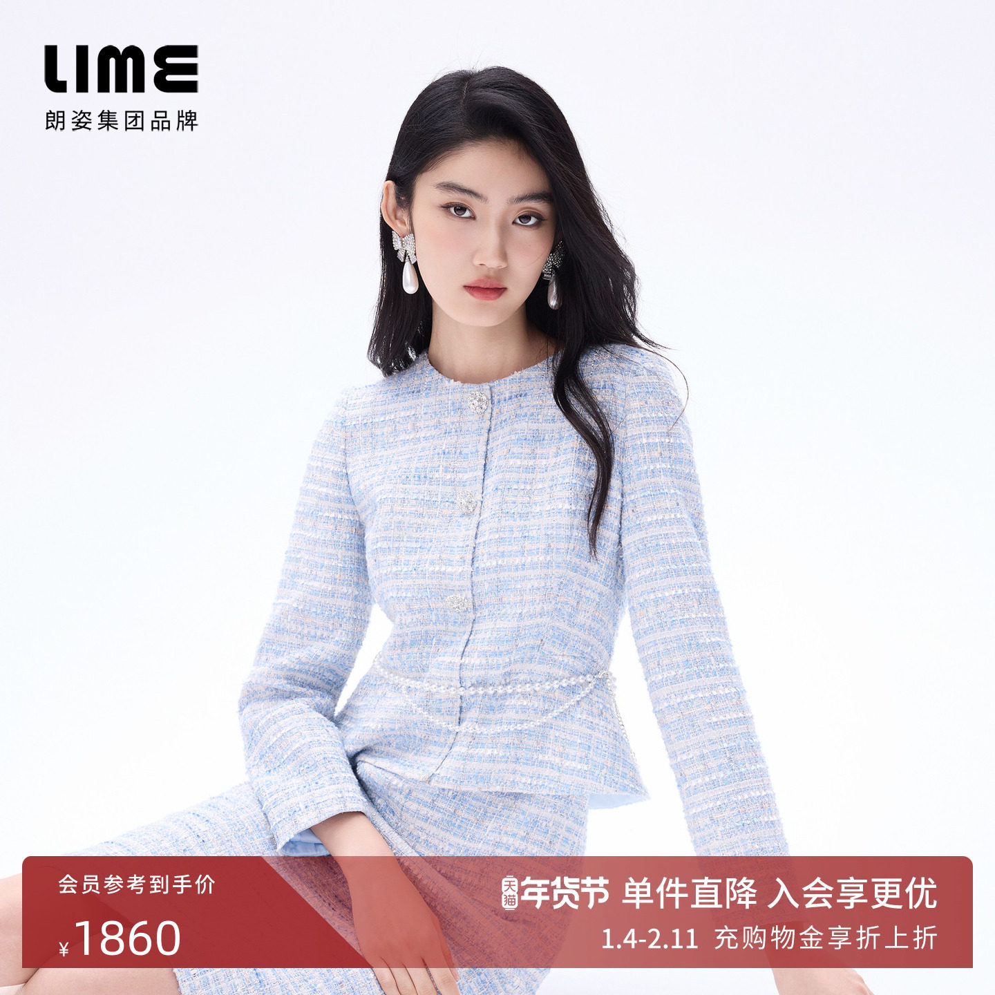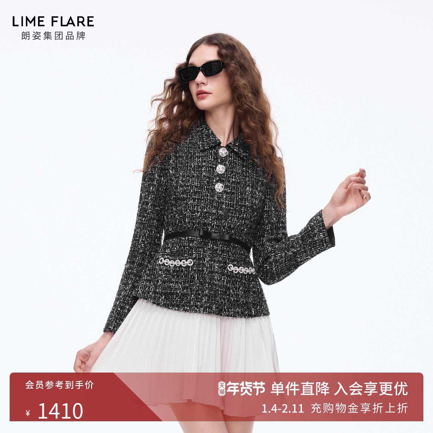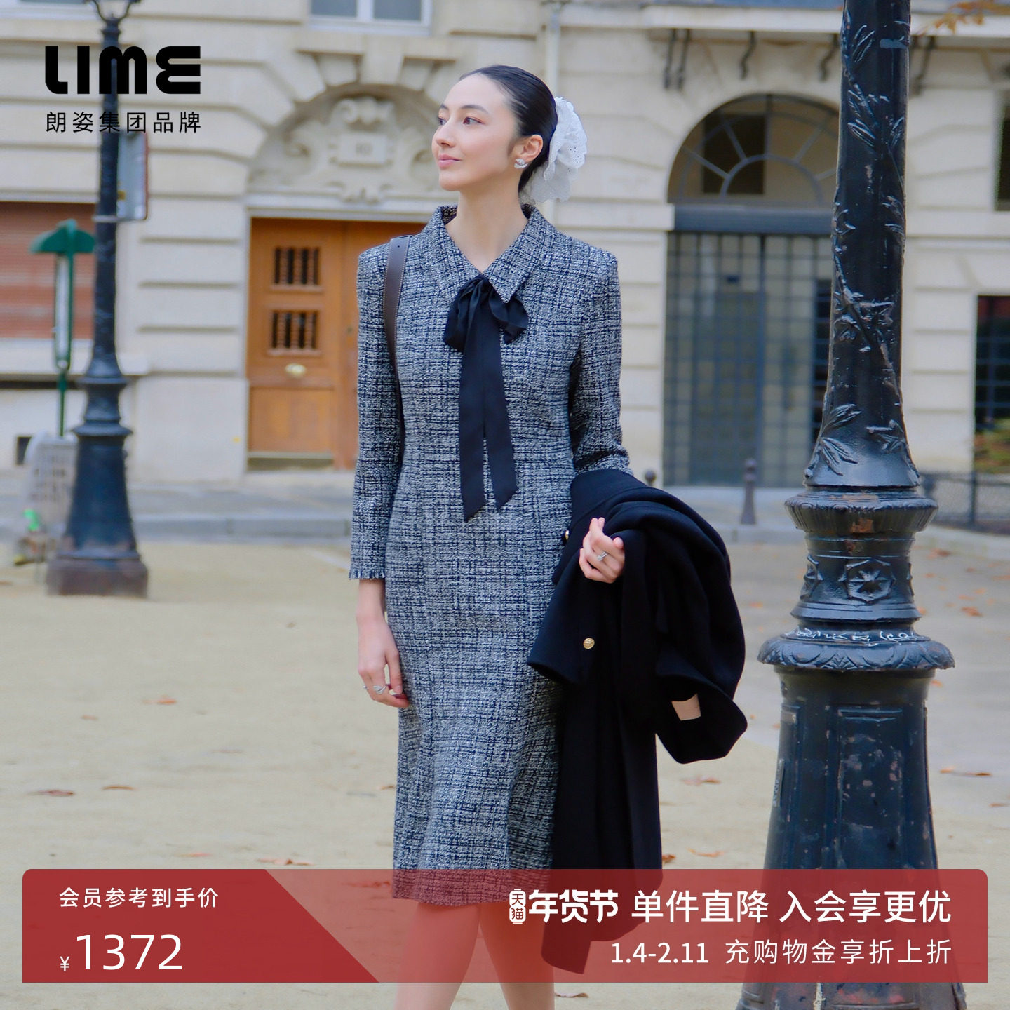 朗姿LIME莱茵小香风收腰修身定制花呢连衣裙双层珠花腰链26春新款