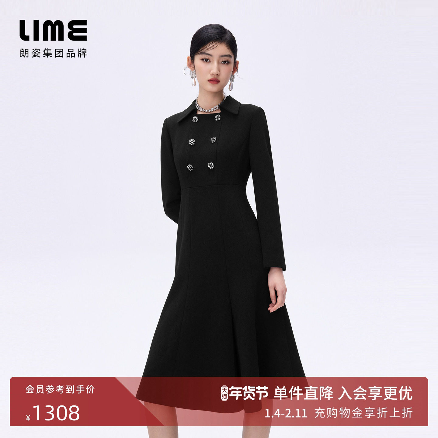 吉娜同款 朗姿/LIME莱茵赫本风法式轻奢珍珠年会香风小黑裙连衣裙