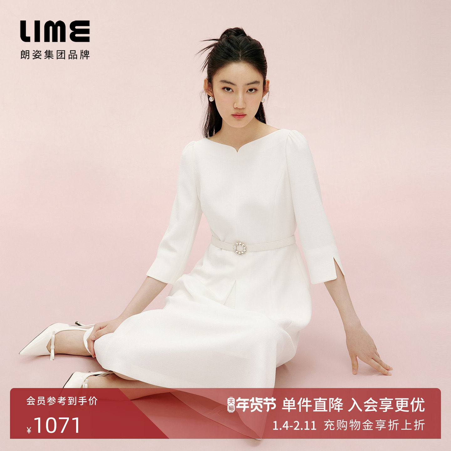 朗姿集团LIME莱茵一字领收腰连衣裙白色25春七分袖优雅高级感裙