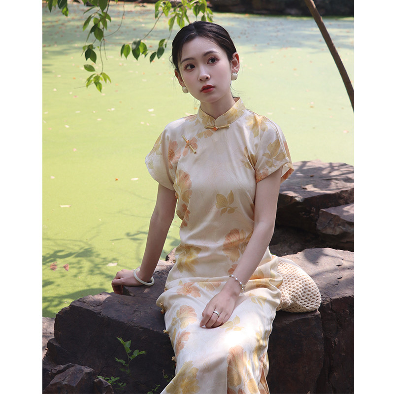 兰佩新中式古法旗袍2025年新款全开襟黄色年轻款宽松少女优雅夏季