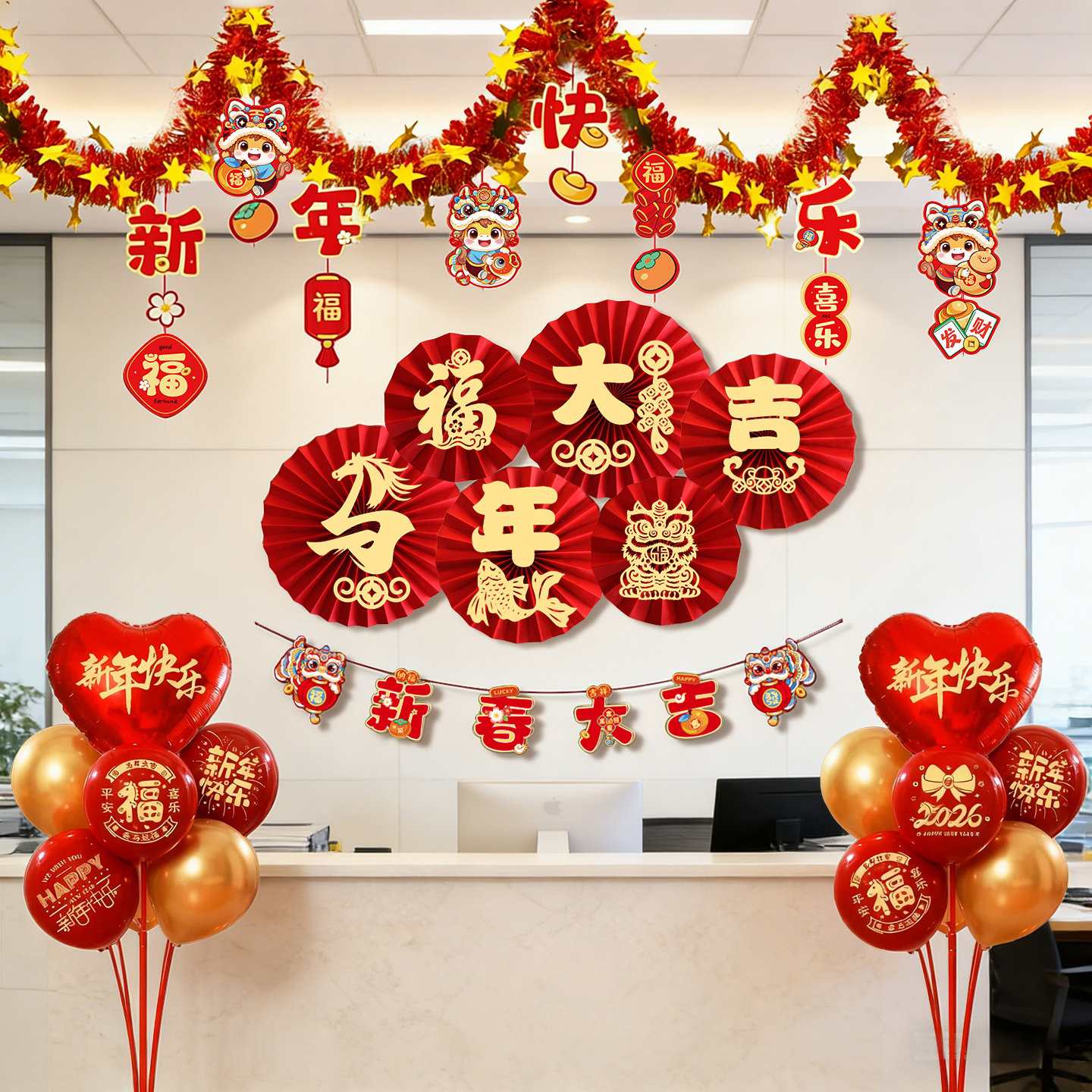 2026马年新年装饰品公司前台收银台拉花彩条吊饰银行大厅氛围布置