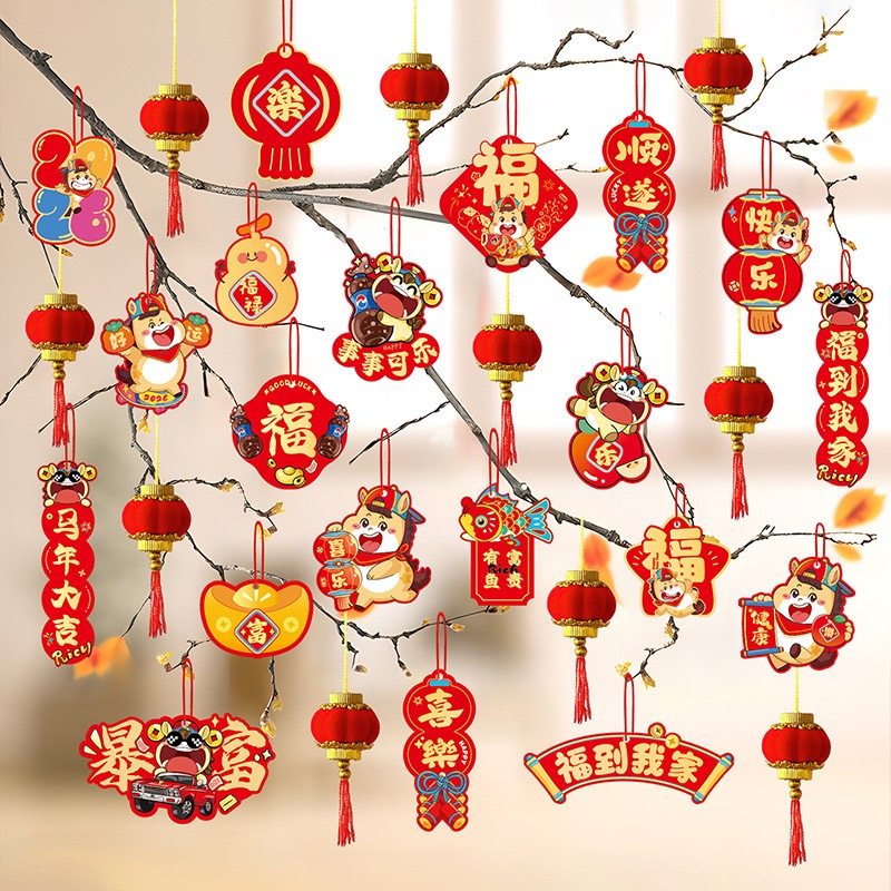 新年装饰挂件2026马年小吊饰灯笼卡纸盆景树上过年春节场景布置