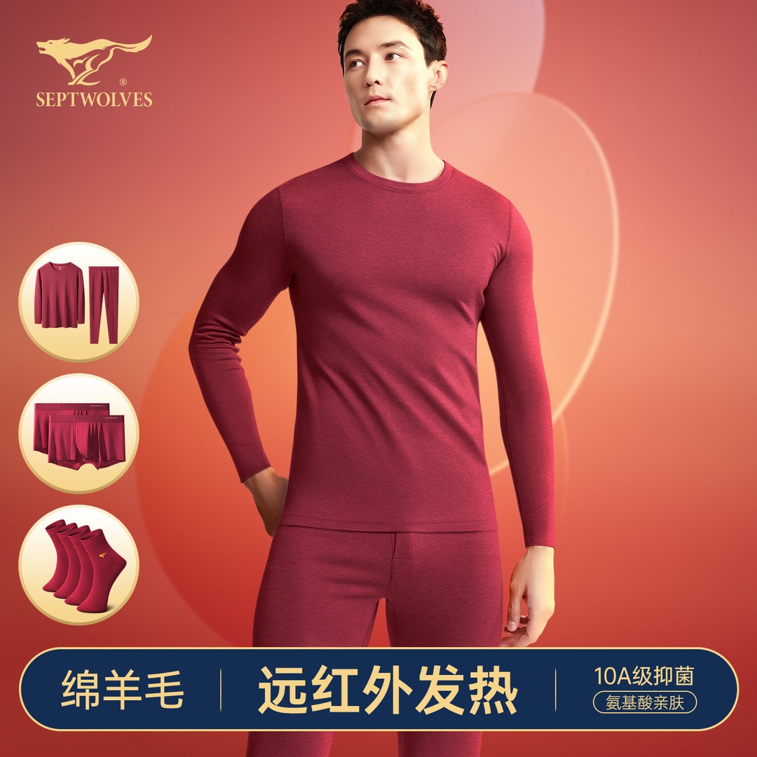 七匹狼男士羊毛内发热酒红色结婚送礼属马年冬款青年保暖内衣套装