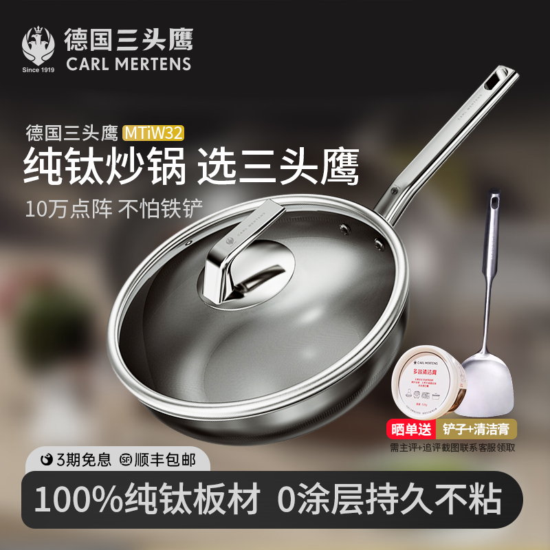 三头鹰德国钛锅炒锅无涂层不粘锅平底煎锅炒菜燃气电磁炉通用纯钛