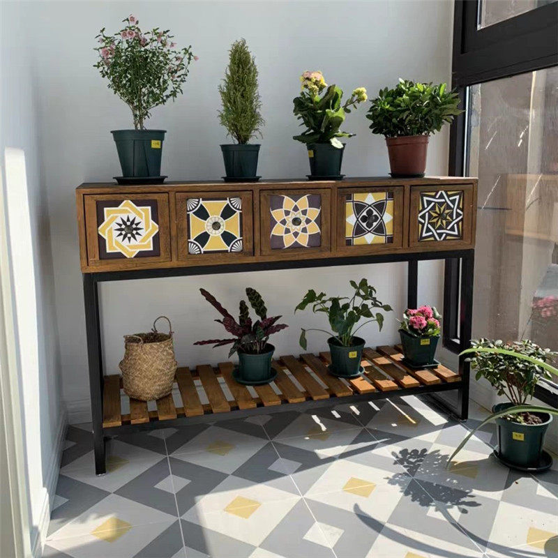 美式复古做旧抽屉花架阳台户外实木花园杂物工作台花盆置物架桌子