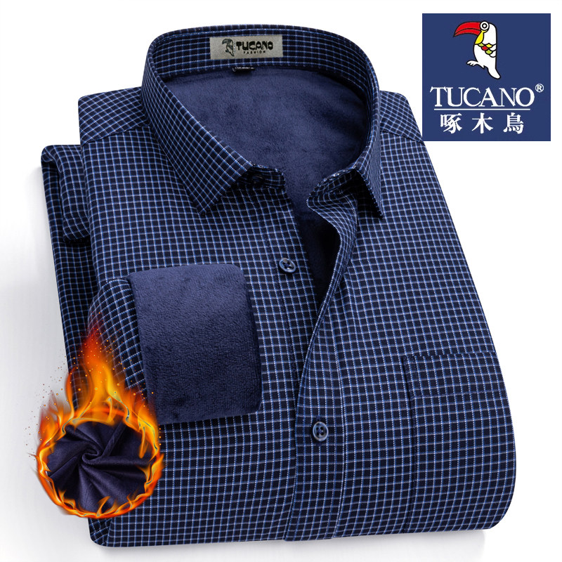 啄木鸟冬季加绒保暖男士衬衫商务休闲蓝格子大码中年长袖正装衬衣