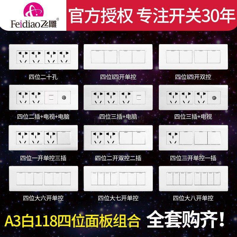 飞雕开关插座118型四位五孔组合模块白色暗装家用墙壁面板长方形