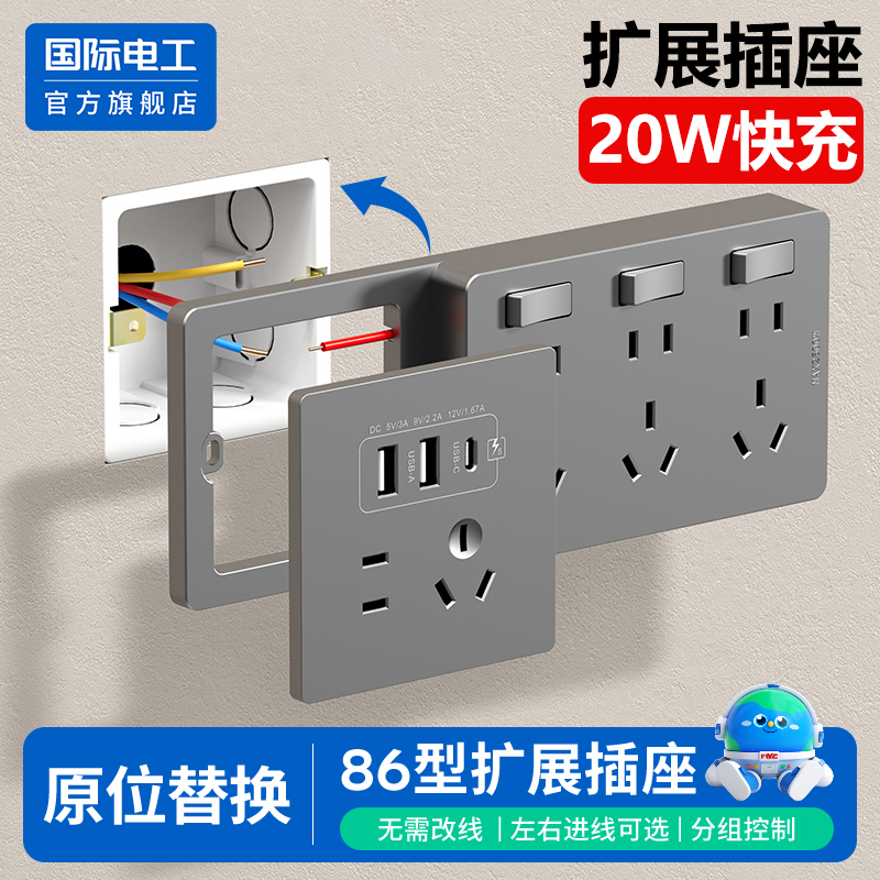 国际电工家用86型扩展插座多孔拓展转换器20W快充USB墙壁排插线板