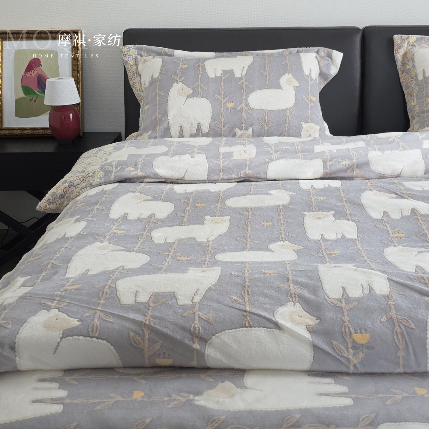 出口韩国秋冬宝宝绒五件套古法水洗仿原麻床上用品加绒布袋四件套