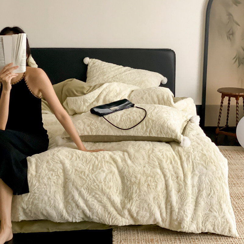 轻奢加厚兔毛绒保暖四件套秋冬雕花牛奶绒防静电被套床笠床上用品