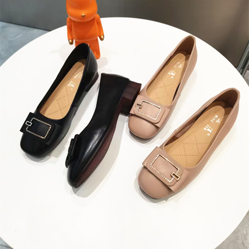 35-36码水钻扣拼色羊皮革真皮方头低跟女鞋子甜美浅口单鞋D07-3