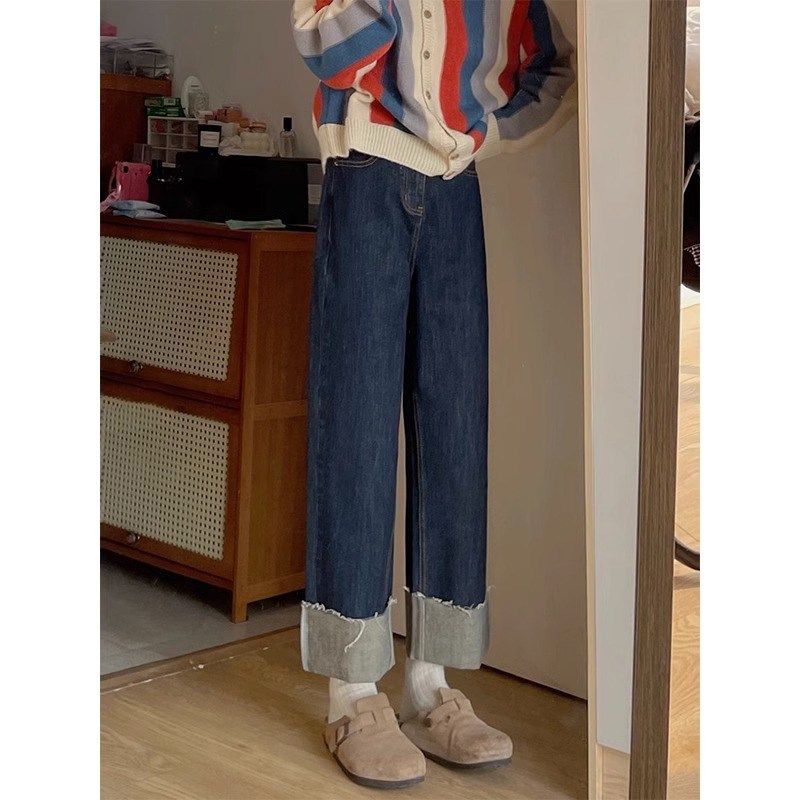 速发深蓝色牛仔裤新款直筒翻边阔子胖妹妹mm梨形身材高腰裤腿裤