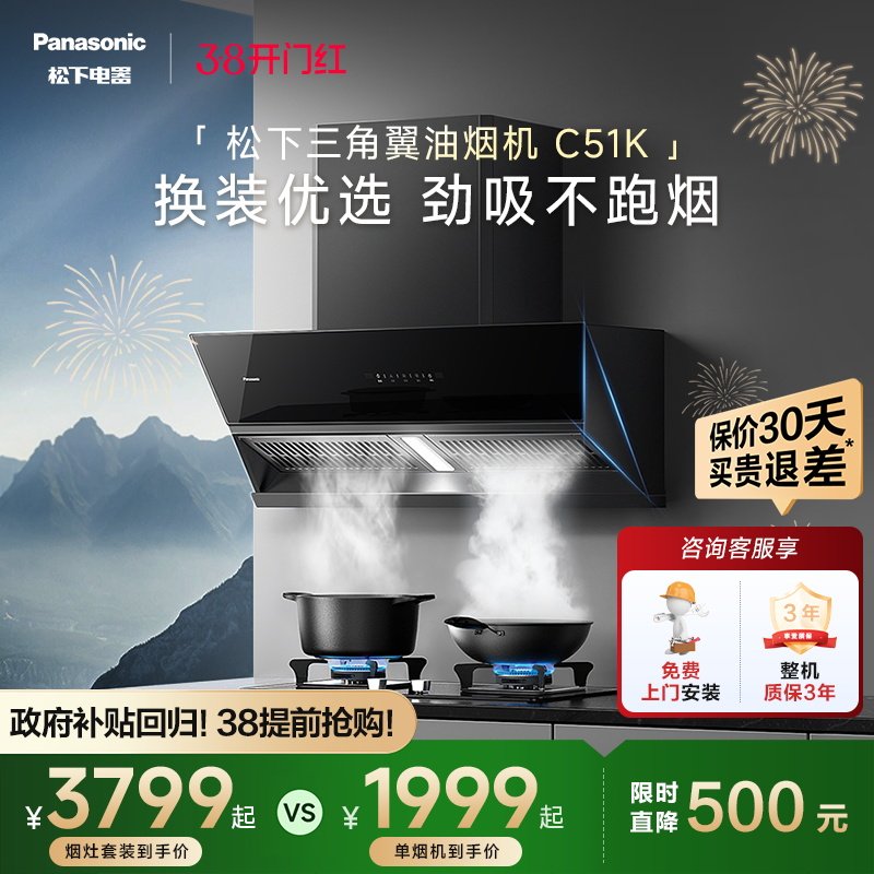 【三角翼侧吸】松下抽油烟机侧吸吸厨房家用大吸力烟灶套装C51K