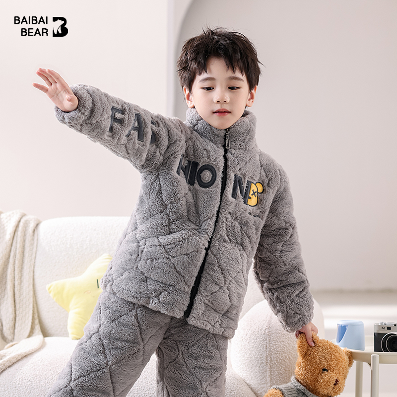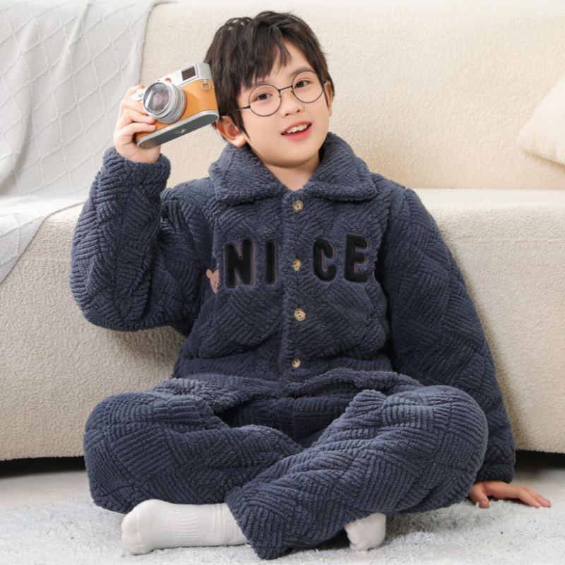 儿童睡衣冬季加厚款家居服珊瑚绒法兰绒三层夹棉加绒大童男孩男童