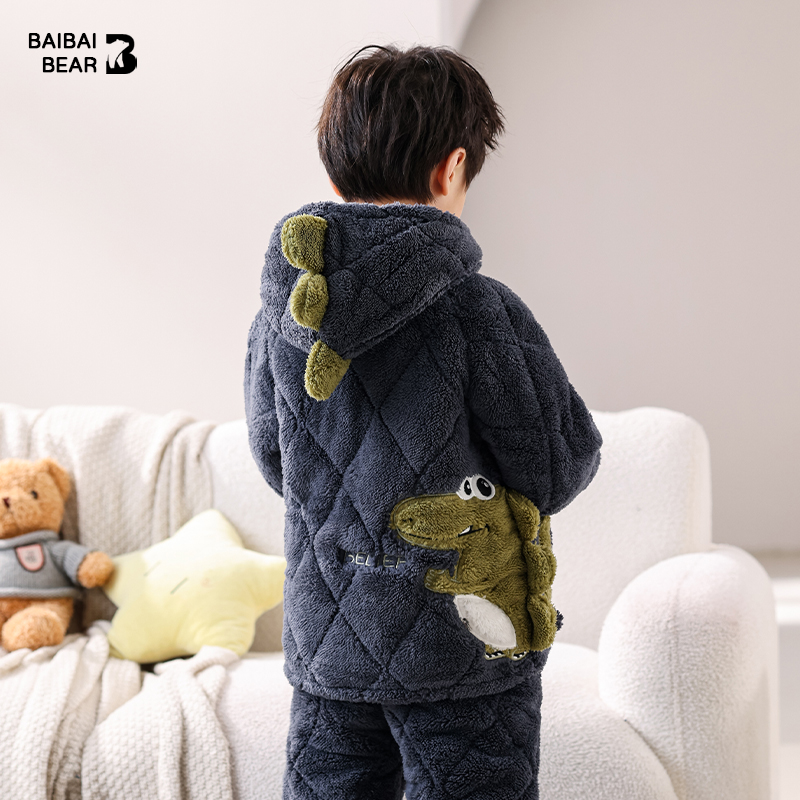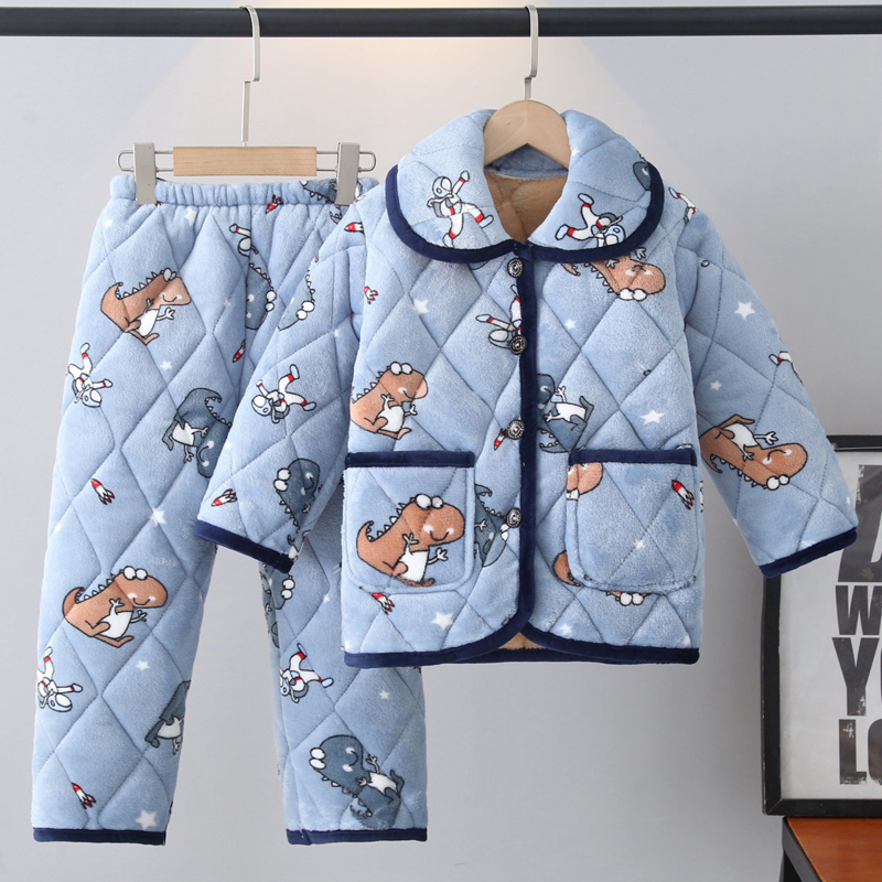 小恐龙儿童睡衣冬季加厚款男童珊瑚绒男孩三层夹棉冬款加绒家居服