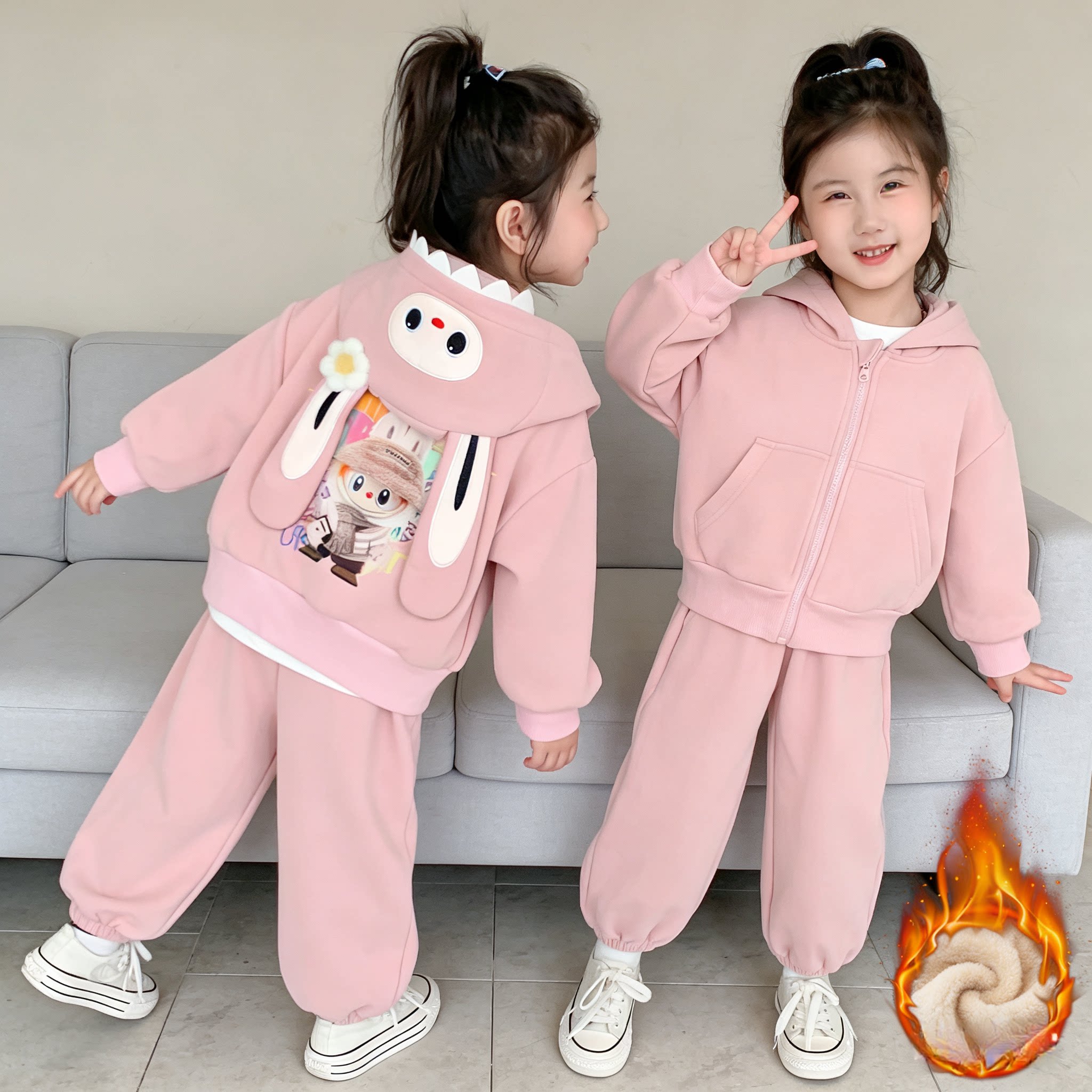 女童加绒套装冬装2025新款儿童韩版猫咪一体绒卫衣休闲裤子两件套