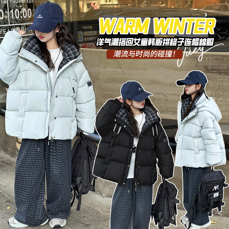 女童加厚棉衣套装秋冬装2025新款韩版洋气儿童装外套格子裤两件套