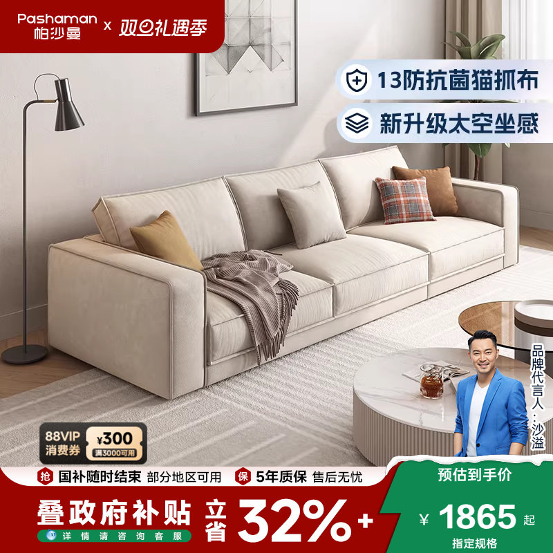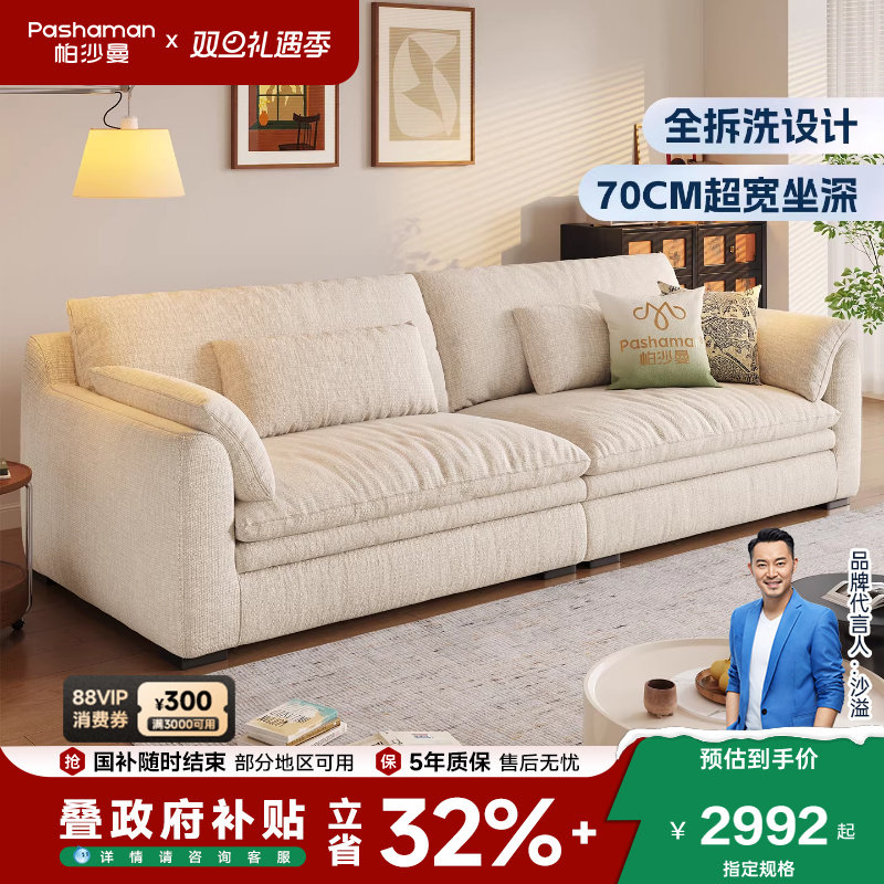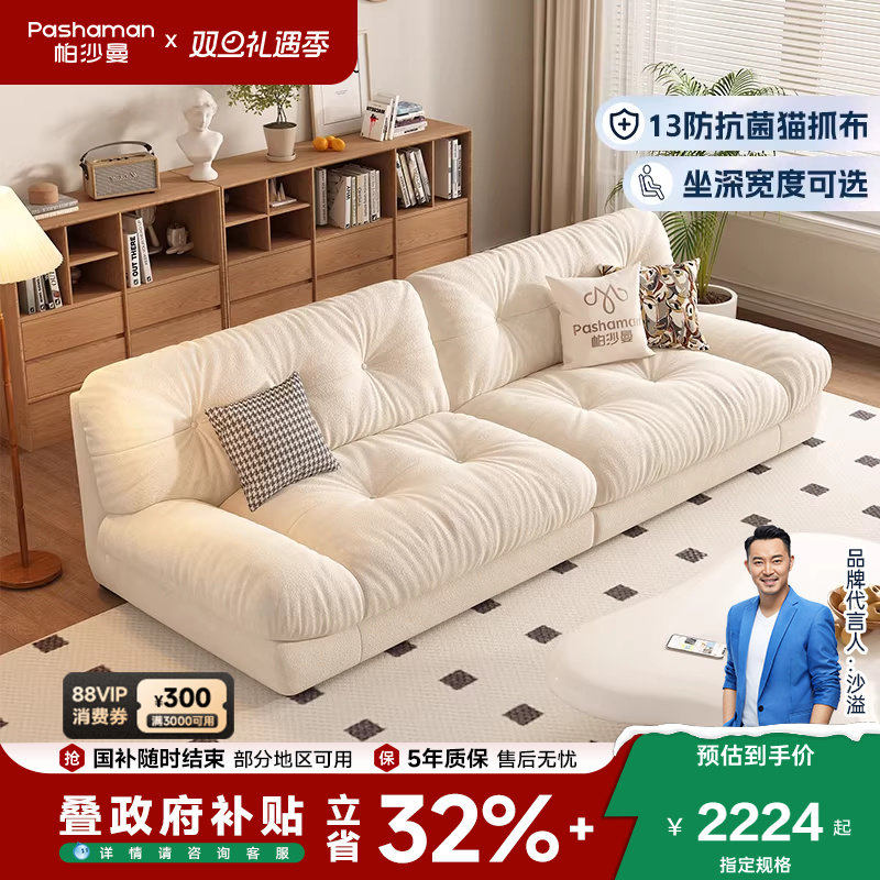 帕沙曼云朵布艺沙发奶油风客厅小户型现代简约三人直排沙发猫抓布