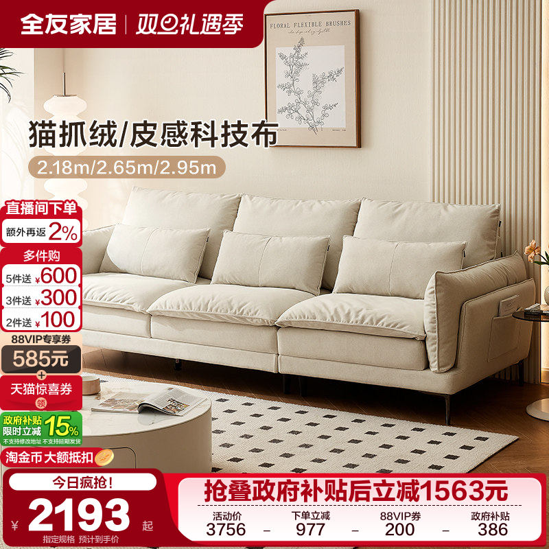全友家居现代简约租房客厅猫抓绒布艺沙发奶油风三人位软包可拆洗