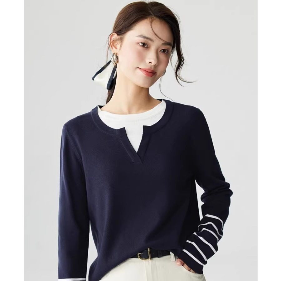 茵曼特价清仓打折撞色条纹拼接假两件毛衣时尚复古显瘦百搭针织衫
