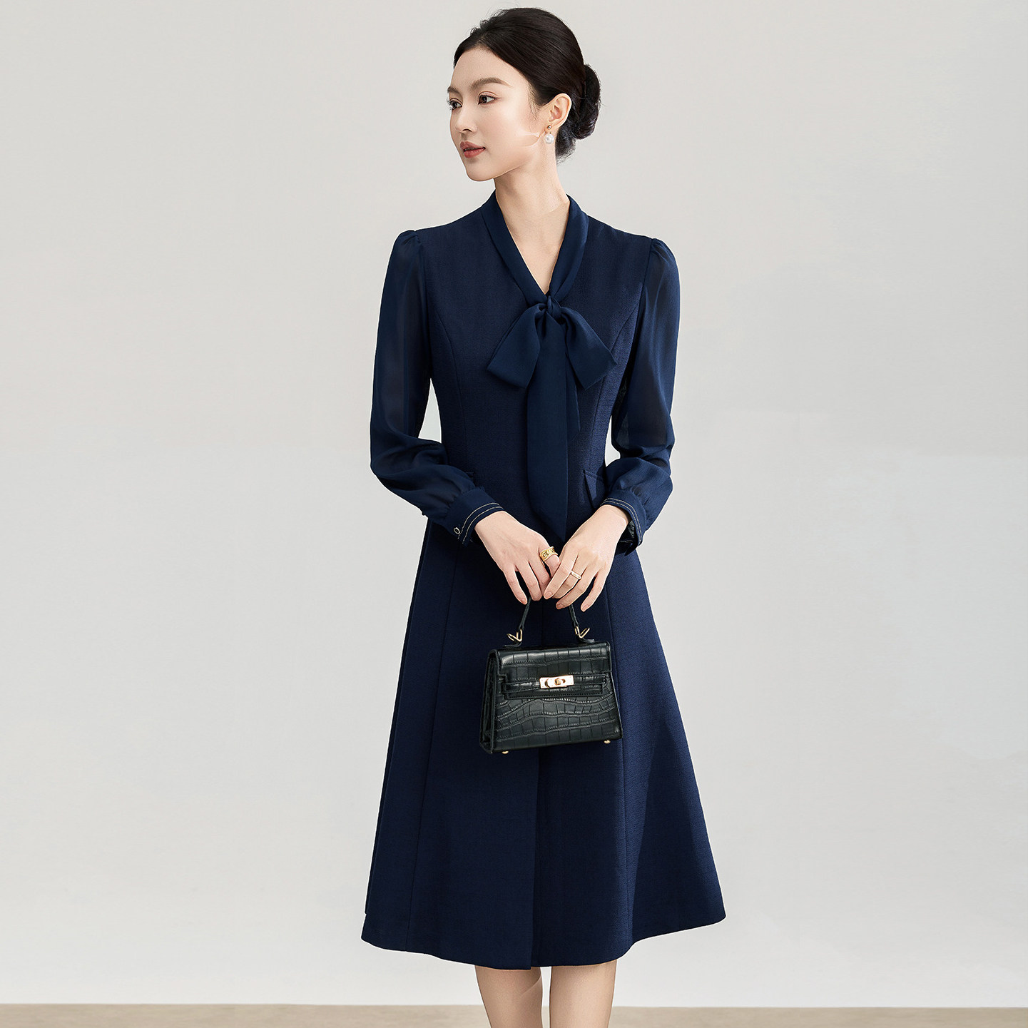H515早春新款赫本风气质名媛女神范高级感职业深蓝色长袖连衣裙女