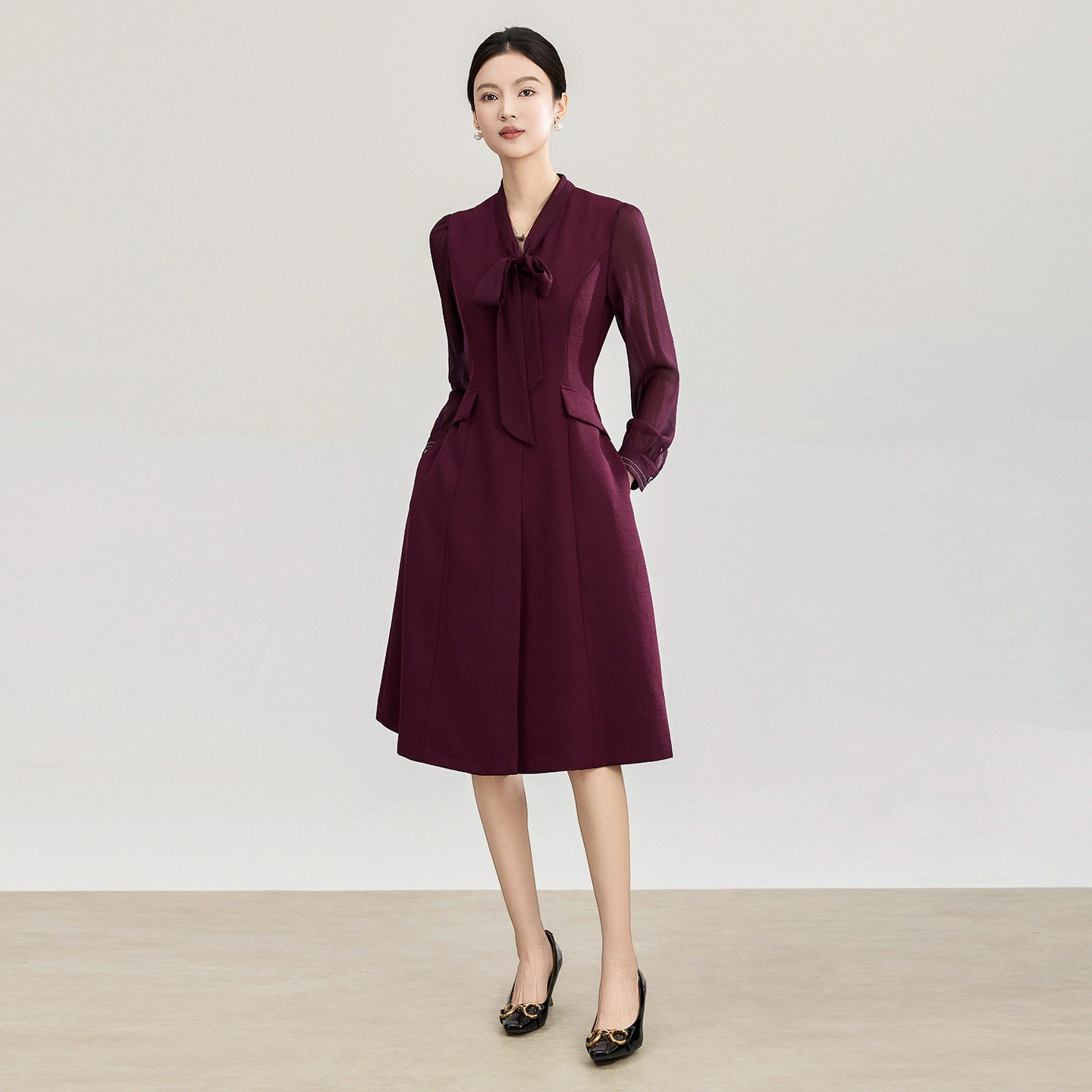 颜域飘带领长袖连衣裙女装2024新款冬季高级感职业气质中长款裙子