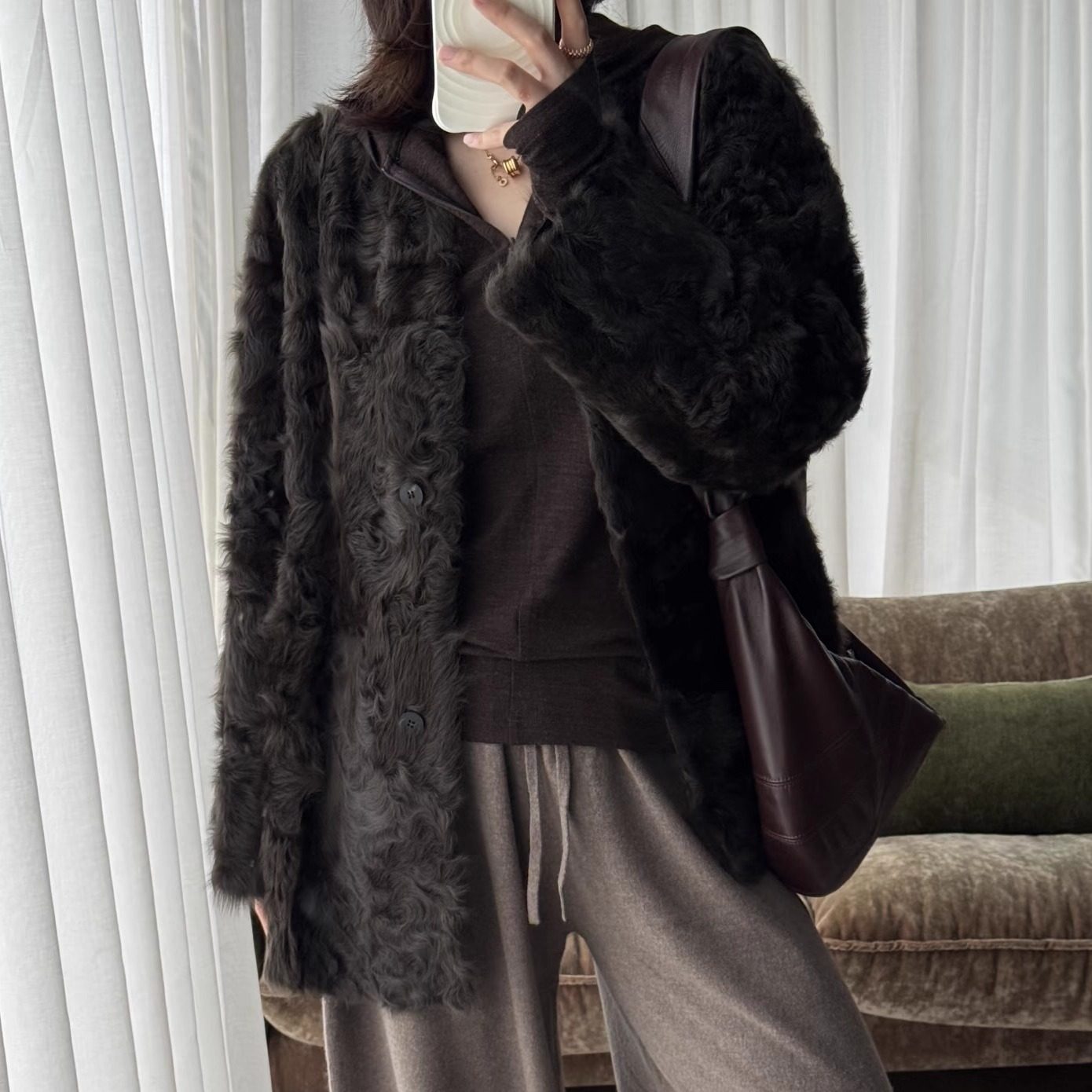 暗黑风小湖羊环保皮草外套女V领冬季中长款加厚水貂皮毛一体大衣
