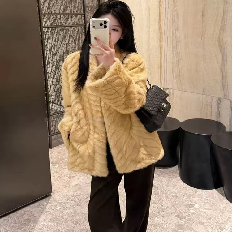 仿水貂毛绒皮草外套女宽松中长款V领金叶貂皮毛一体冬季韩版大衣