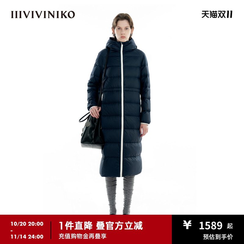 IIIVIVINIKO“轻薄防钻绒面料”收腰修身轻薄超长款过膝羽绒服女