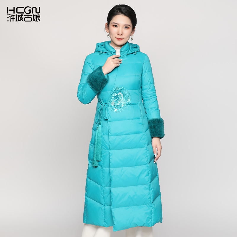 浒城古娘新款精致刺绣黑色收腰超长修身新中式国风羽绒服女款冬季