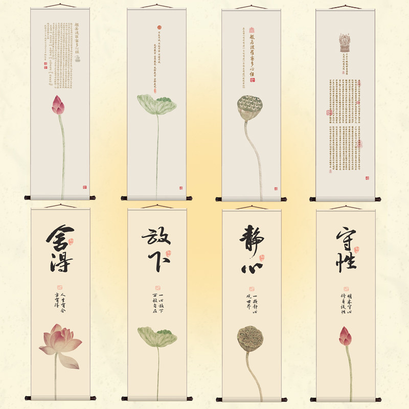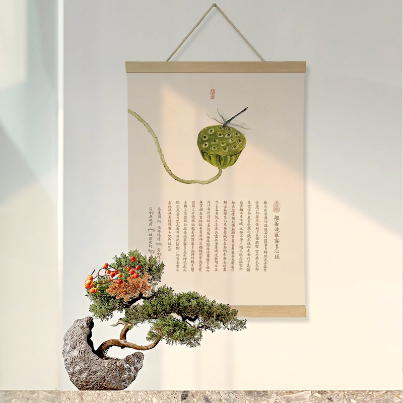 般若菠萝蜜多心经卷轴挂画中式禅意荷花客厅装饰画茶室书房玄关画