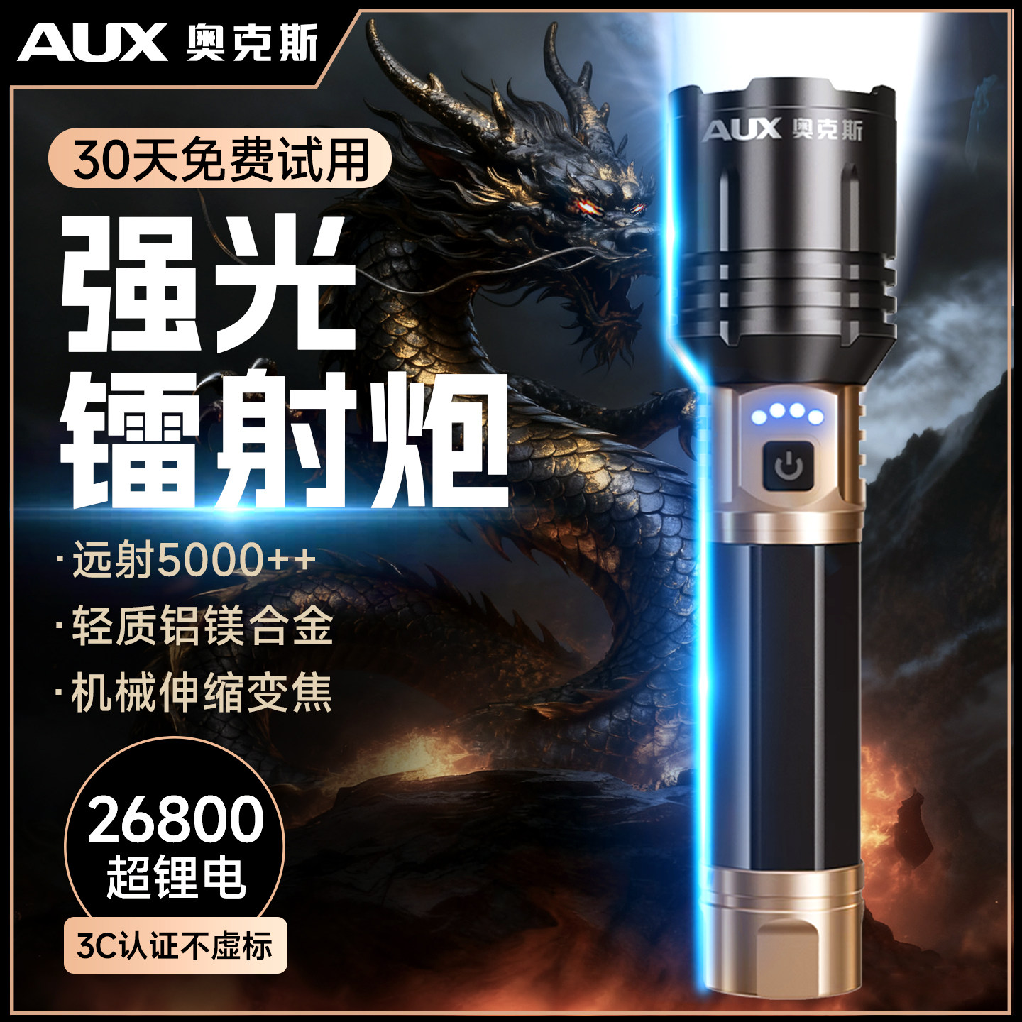奥克斯强光手电筒远射超亮大功率充电超长续航大容量激光2025新款