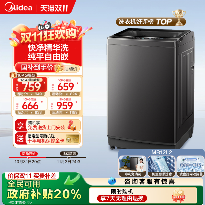 以旧换新美的10/12KG大容量全自动家用直驱变频波轮小型洗衣机L2