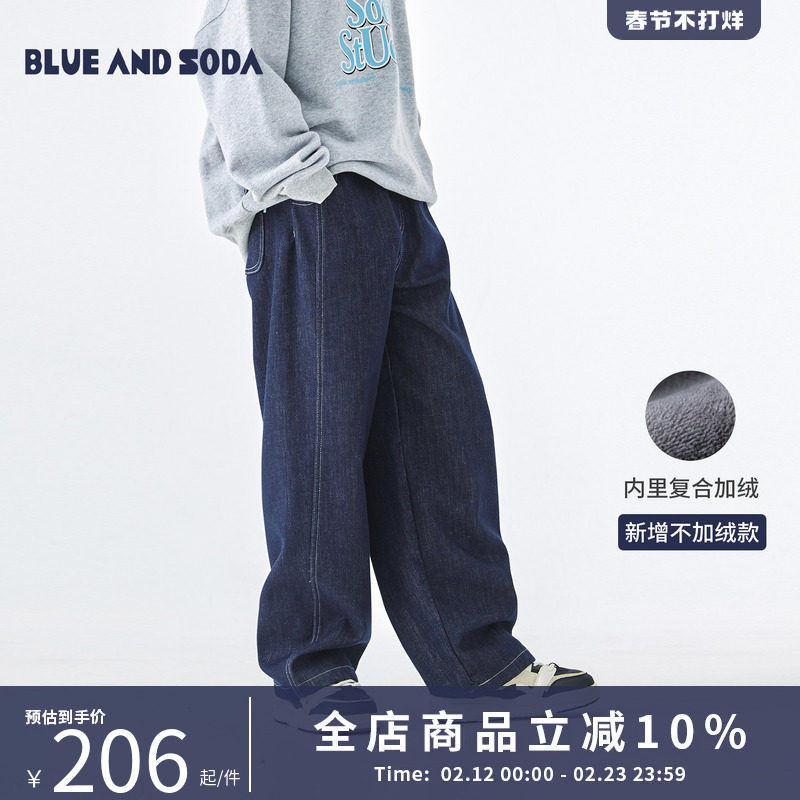 加绒加厚复古弯刀牛仔裤男冬季保暖宽松青少年学生直筒百搭阔腿裤