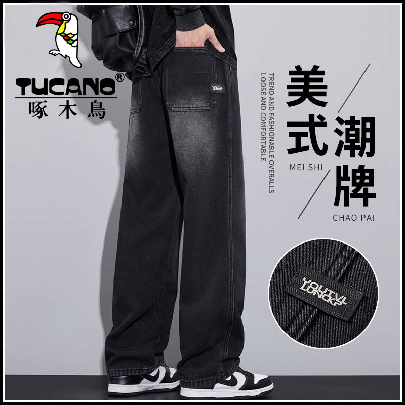 啄木鸟牛仔裤男款秋冬季加绒青少年潮流阔腿直筒男生美式休闲长裤