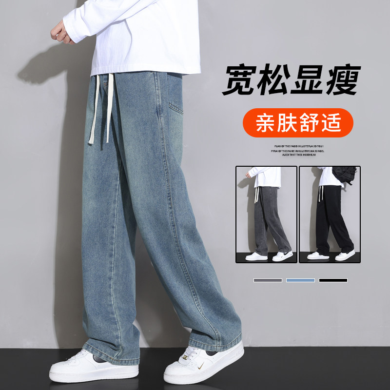 GOGOSOON牛仔裤男新款2025春秋抽绳直筒宽松阔腿松紧带长裤青少年