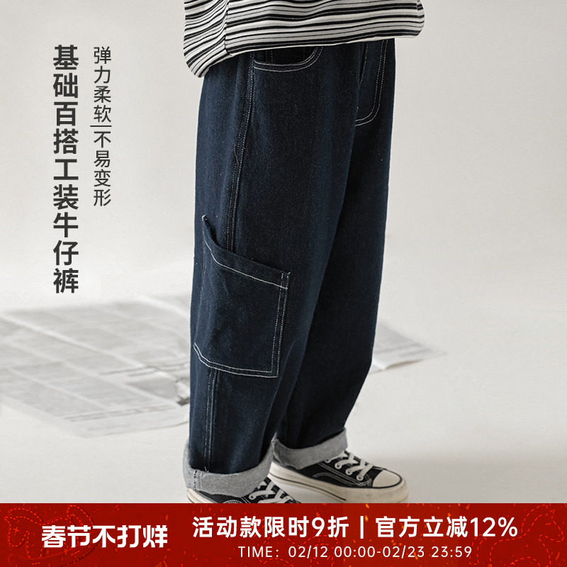 GOGOSOON工装牛仔裤男春秋新款松紧腰高级直筒宽松美式抽绳青少年