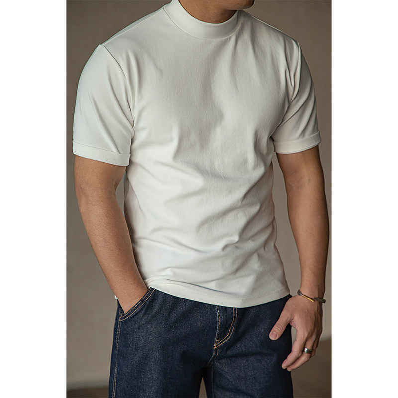 唔刃美式复古重磅弹力棉半高领半袖t恤短袖打底衫修身内搭男春秋