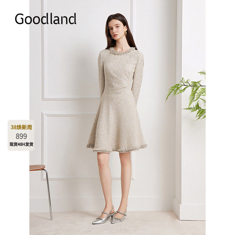 Goodland美地米色优雅法式花纱小香风连衣裙2025新款LC35305360