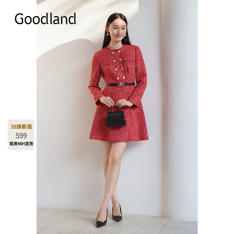 Goodland美地女装2024年冬季新款v领修身红色小香风连衣裙短款