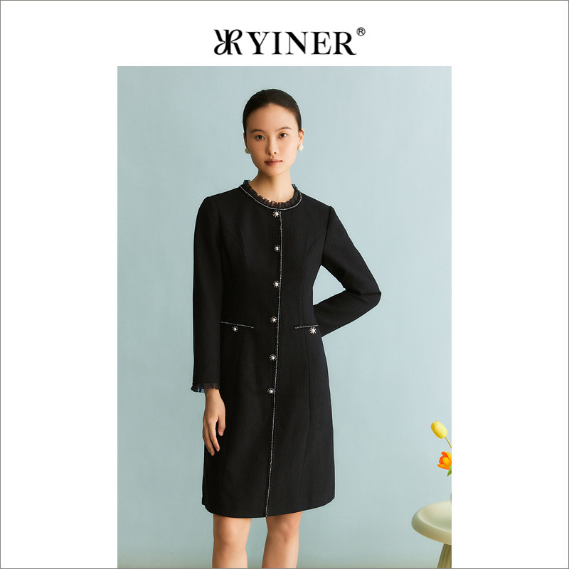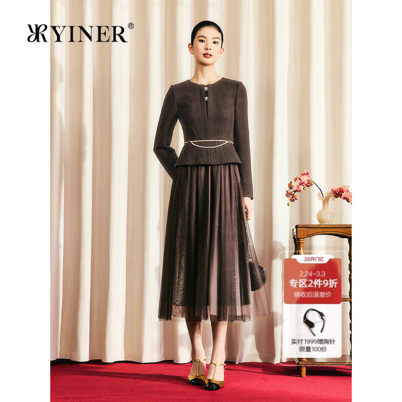 YINER音儿专选冬季女装冬季时尚赫本风花纱小香风假两件连衣裙