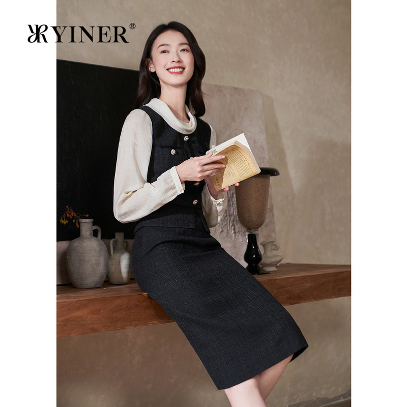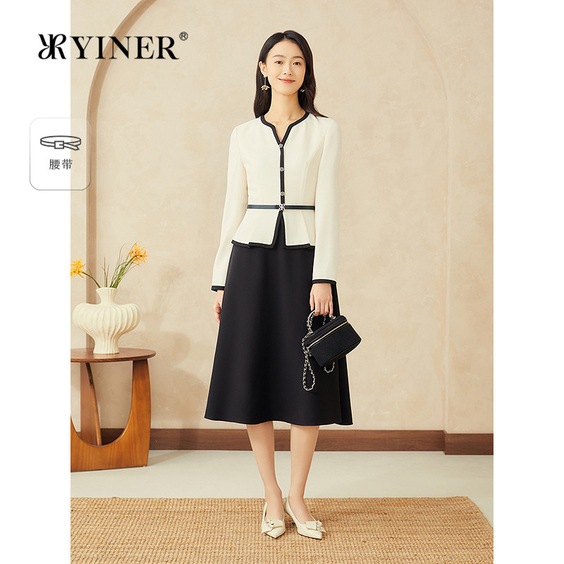 YINER音儿专选秋季法式轻职风小黑裙撞色V领收腰假两件连衣裙