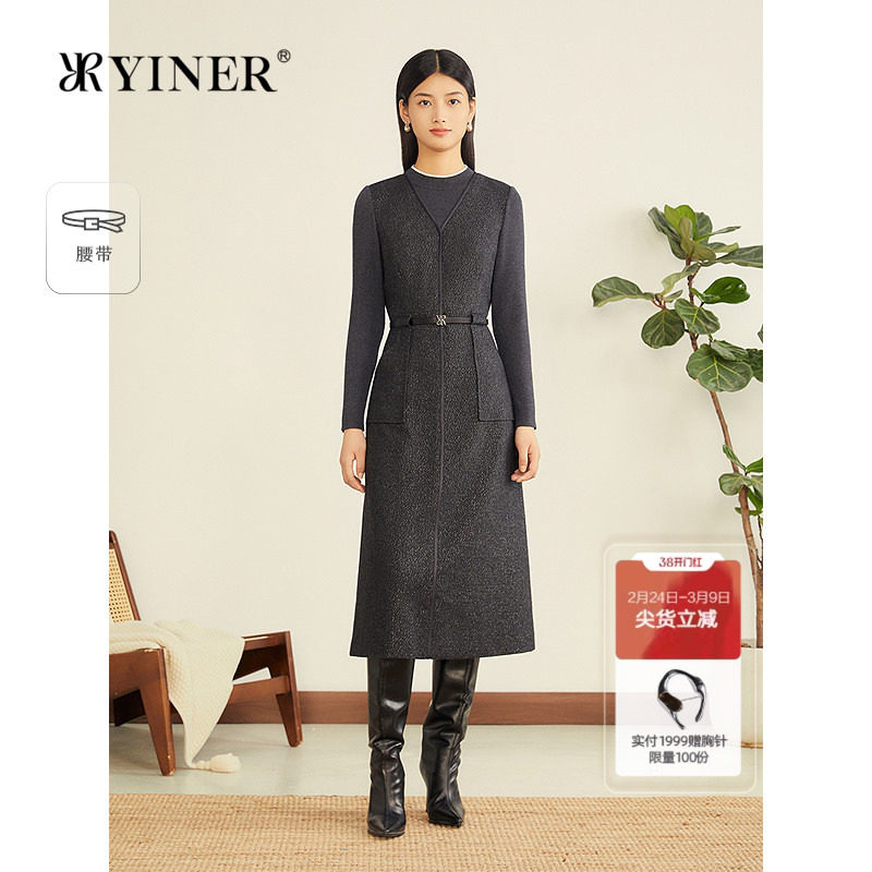YINER音儿女装冬季法式美丽诺羊毛混纺重工立体裁剪V领连衣裙